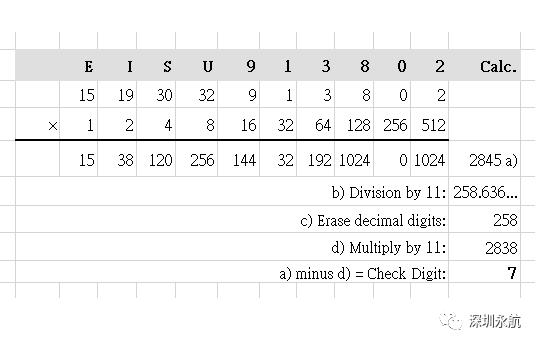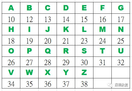 根据校验规则,箱号的每个字母和数字都有一个运算的对应值。箱号的前10位代码中,数字的对应值为自身,即0到9,而字母A到Z对应数值为10到38,因11、22、33不能对11取模数,所以被除去。