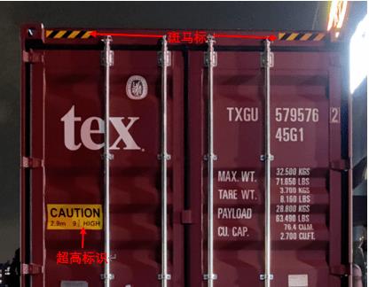 按照严格标准要求,凡高度超过2.6m的集装箱应贴上超高标识,可以看到下图,因为我们的集装箱是2.9m超过了规定的2.6m高度,所以也贴上了超高标识。