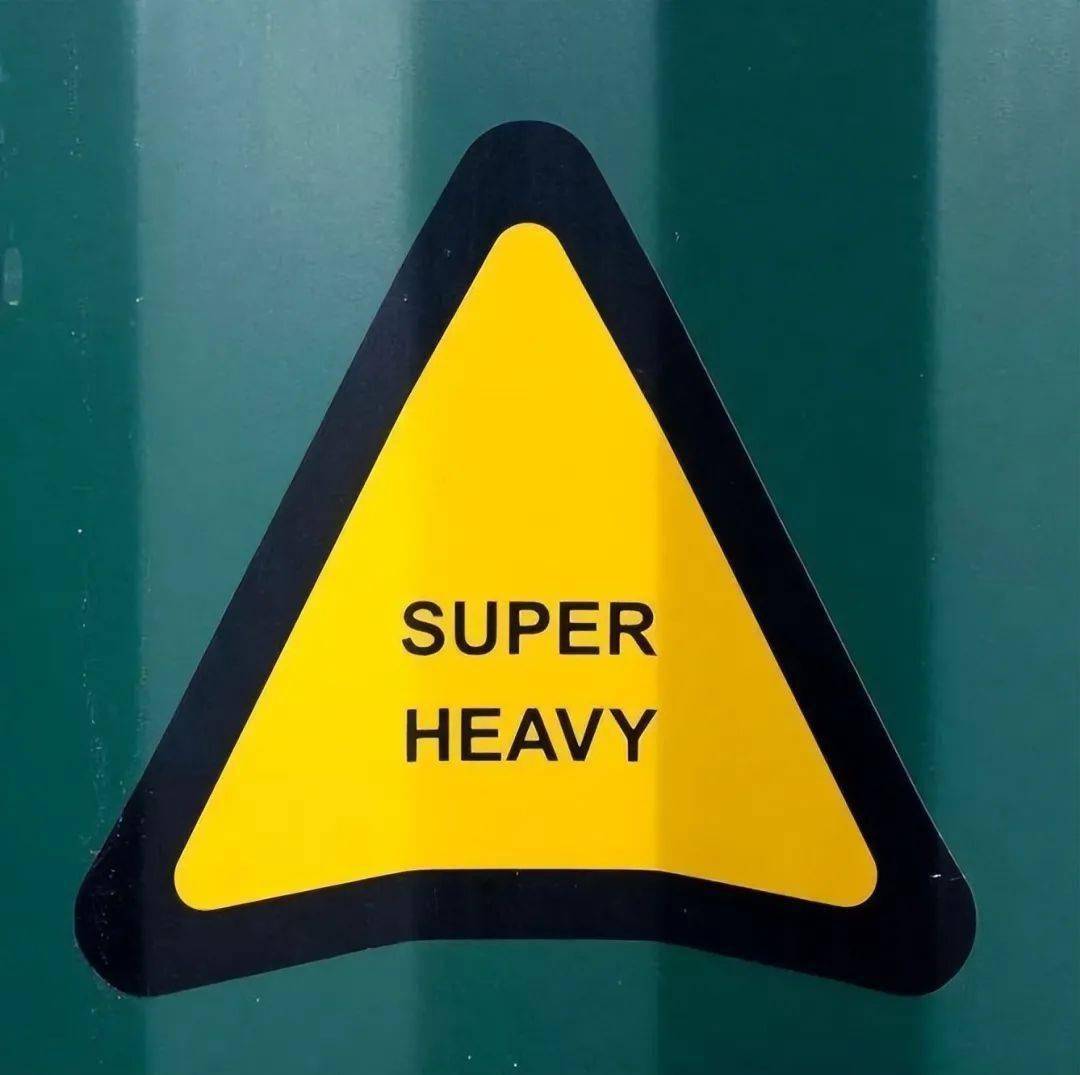 ISO规定,凡最大总重(MGW)超过30480kg的集装箱则为超重箱,需要在箱体外粘贴一个三角形超重标记。该标记为三角形黑边,里头黄色底色上印着黑色英文字体“SUPERHEAVY”。