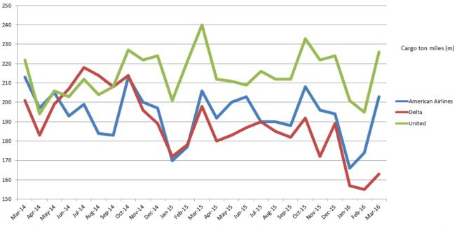 三个美国航空公司录得最大跌幅是达美航空,与去年同期相比货运量下降17.5%,下降至153m CTM ( cargo ton miles ) 。