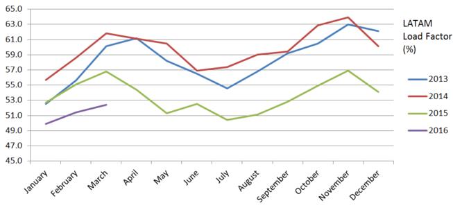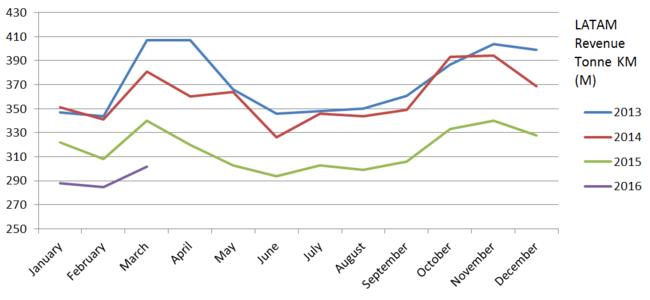 对于拉美集团(LATAM Group)来说,由于巴西面临25年来最严重的经济衰退,在2016年3月 LATAM 同比去年需求下降11.2% ,收入为 302m RTKs ( revenue tonne km)。第一季度,则下降9.8% 到 875m RTK。