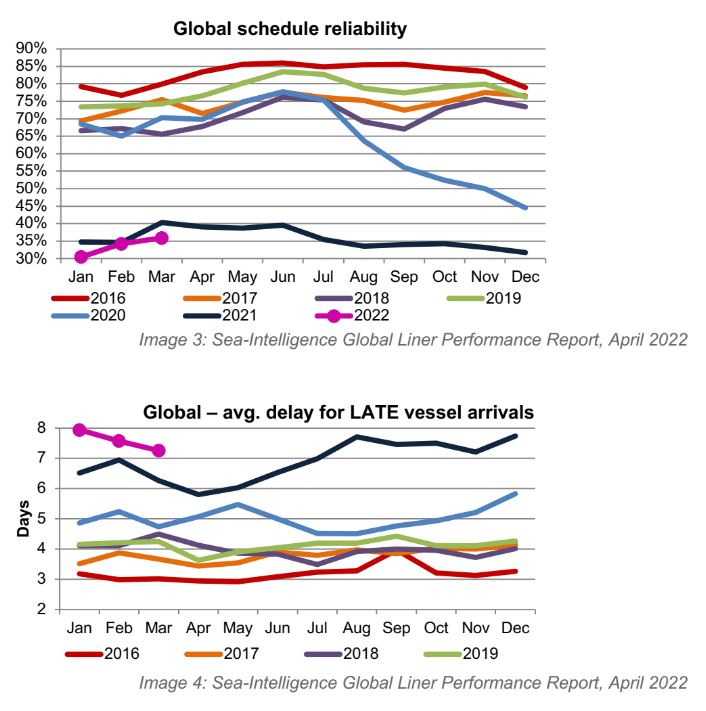 Sea-Intelligence 最新的《全球班轮性能报告》数据显示,船舶时刻表准确性虽然在 2022 年 3 月略有改善,但在 2020 年至今期间一直下降至前所未有的低点。