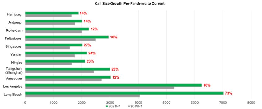 在大流行期间,每艘船舶在全球主要门户港口需要装卸的平均集装箱数量激增,导致本已紧张的供应链进一步延误和拥堵。根据 IHS Markit 最新的港口绩效数据,美国、北欧和亚洲主要港口的集装箱停靠量增加了 10% 至 70%(与 2019 年上半年相比)。随着全球贸易量回升,平均每艘船舶每次停靠需要超过 3000 个集装箱。在美国长滩港,现在的平均停靠量比大流行前增加了 70% 以上,大型远洋船舶的码头平均每次停靠处理 7,000 多个集装箱。在新加坡港和洋山(上海港),停靠量在过去两年分别增长了 27% 和 23%。而 Felixstowe(英国)和安特卫普的停靠量分别增加了 18% 和 14%。由于船舶规模的增加和班轮网络的优化,在大流行之前,呼叫规模已经在增加。随着贸易量从 2020 年底开始大幅回升,强劲反弹和不可预测的需求放大了这一趋势,导致许多全球港口出现延误,以应对间歇性需求高峰。