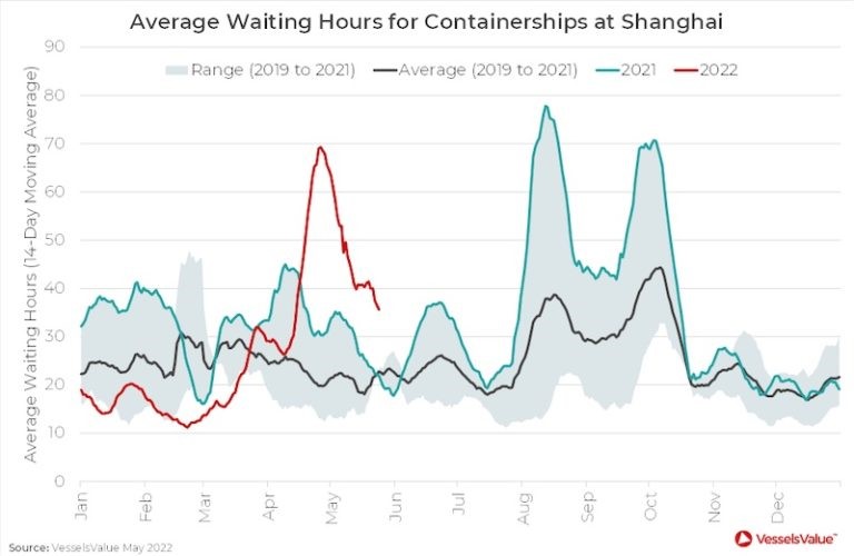 VesselsValue 数据显示,港口油轮、散货船和集装箱船的平均等待时间现在已从 4 月下旬报道的 omicron 传播高峰期的 66 小时峰值降至今天的 34 小时。这比去年这个时候的水平长了大约 10 个小时,也是三年范围的上限。