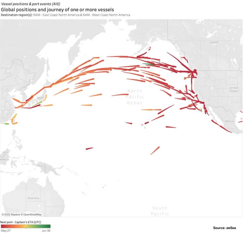 丹麦班轮分析平台 eeSea为Splash编制的数据显示了开往北美和欧洲的集装箱船(见下图),eeSea 创始人 Simon Sundboell 表示,目前还没有出现令人担忧的海啸效应。