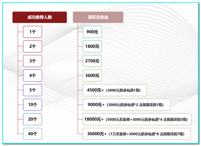 5、间接福利4:如果您每成功推荐5个代理,公司再送价值3000元一箱(共六瓶)茅台集团茅仙酒;