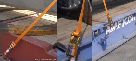 如上图:绑扎带。绑扎带是非常方便快捷的绑扎材料。一般来说,单条绑扎带承受拉力小于5吨,而实际上考虑到绑扎带质量等因素,要留出足够的富裕。中图为绑扎带自带的紧固加力器。