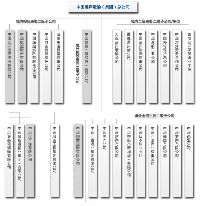 目前,中国远洋运输集团已在境内外控股中国远洋、中远太平洋、中远国际、中远投资、中远航运5家上市公司,参股中集集团、招商银行、招商证券等3家上市公司。
