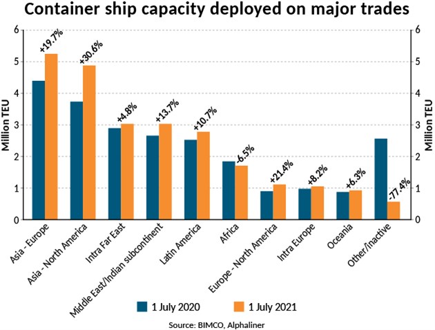 远东至欧洲贸易运力在过去一年增长 19.7% 至 525 万标准箱,而远东至北美贸易运力增长 30.6%。