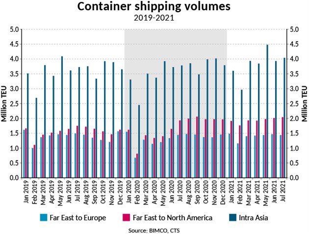 在全球最大的贸易亚洲内部,今年前七个月的交易量已上升至 2680 万标准箱,比 2020 年前七个月增长 11.3%,比 2019 年增长 7.8%。