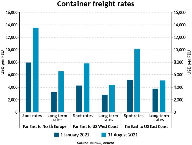 较高的运费是将运力从较小的贸易转移到主要的东西向航线的主要吸引力。在远东至北欧航线上,即期基准利率为每 FEU 13,526 美元,长期利率为每 FEU 6,544 美元。在远东到美国西海岸的贸易中,8 月 31 日的现货和长期运费分别为每 FEU 7,868 美元和每 TEU 4,378 美元。此外,一些托运人支付了数千美元的附加费,以确保他们的货物及时上船。