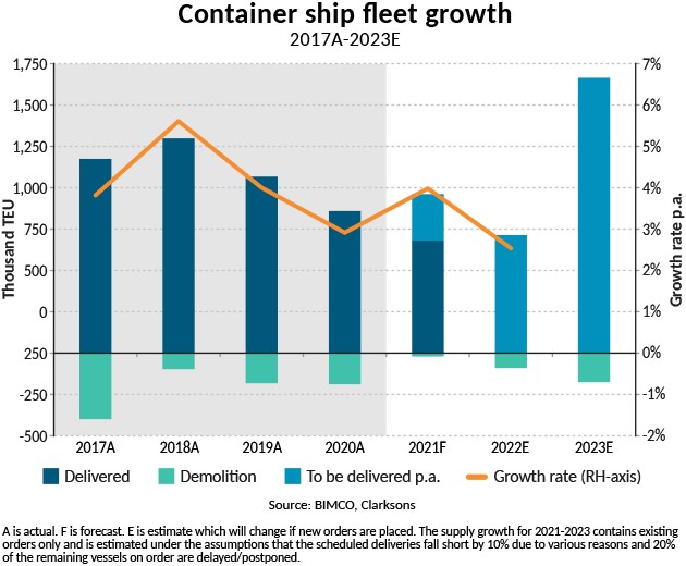 预计 2021 年交付的容量中,大约三分之二已经到货。结合低拆迁活动,这意味着今年集装箱运输船队已经增长了 2.5%。BIMCO 预计,在已经交付的 6.04 亿标准箱的基础上,还将再增加 3.2 亿标准箱,这将使全年船队增长 3.8%。