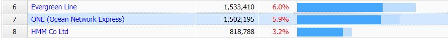 根据 Alphaliner 的数据,ONE 是全球第 7 大集装箱航运公司,其 TEU 容量为 150 万标准箱。