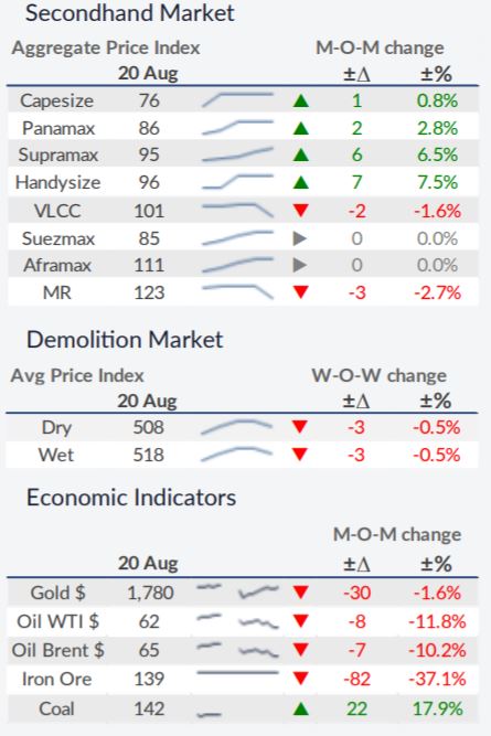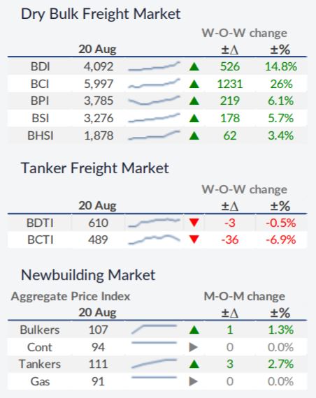 干散货市场已上涨至 2010 年以来的最高水平。然而,由于基本面疲软,最近的上涨可能是短暂的。在其最新的周报中,船舶经纪商 Allied Shipbroking 表示,“8 月中旬,干散货市场似乎再次“着火”,上周 BDI 指数在 11 年来首次突破 4,000 个基点大关。尽管今年迄今为止已经出现了显着的复苏,但市场始终对其能够提供更大的运费水平上行动力感到惊讶。尽管过去一周的显着攀升主要归功于好望角型市场,该市场在一周内上涨了 25% 以上,但干散货市场整体继续保持强劲,所有其他较小尺寸的细分市场也显示出进一步的增长他们的运费数字”。