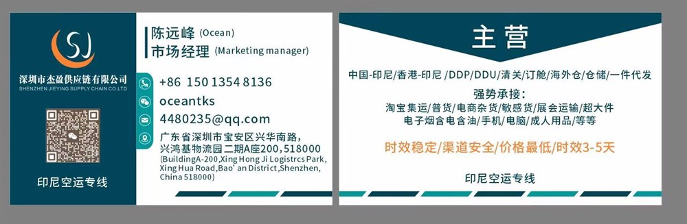 主要经营:印尼空运DDP/DDU/B2B/B2C代理清关深圳市杰盈供应链有限公司成立于2017年,与客户共同成长。我们相信客户选择我们是因为我们的价值观和能力。SJC帮助您在当今的全球市场上取得成功,而要想成功,您必须掌握国际贸易的艺术。