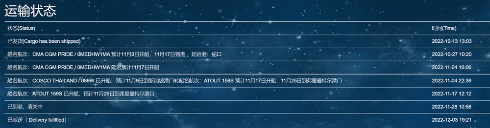 Lawrie的家具是国庆后,也就是十月份初安排送到递接物流仓库的,然后Kevin就开始安排测量尺寸和重量,Lawrie确认数据无误后,提供了货物的装箱清单,然后Kevin安排装柜发货等事宜,下面是Lawrie的船期信息,递接有物流网站可以给到客户进行船期等动态信息的查询,无需咨询Kevin。