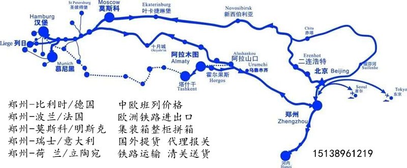 国际铁路专线郑欧铁路货运班列始于郑州,经新疆阿拉山口入境,途径哈萨克斯坦、俄罗斯、白俄罗斯和波兰后达到德国汉堡,全程10214公里,郑州—汉堡 汉堡—郑州 全程来回15天,比走海路到欧洲要快25天左右。