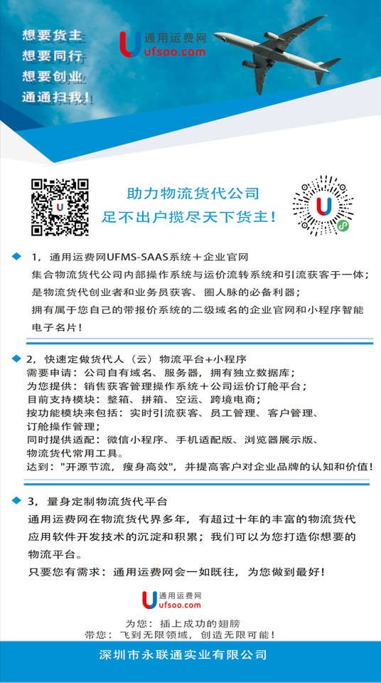 1、货代操作系统UFS(包含海运整箱,海运拼箱,空运,拖车、海派,空派及财务核销系统等)。